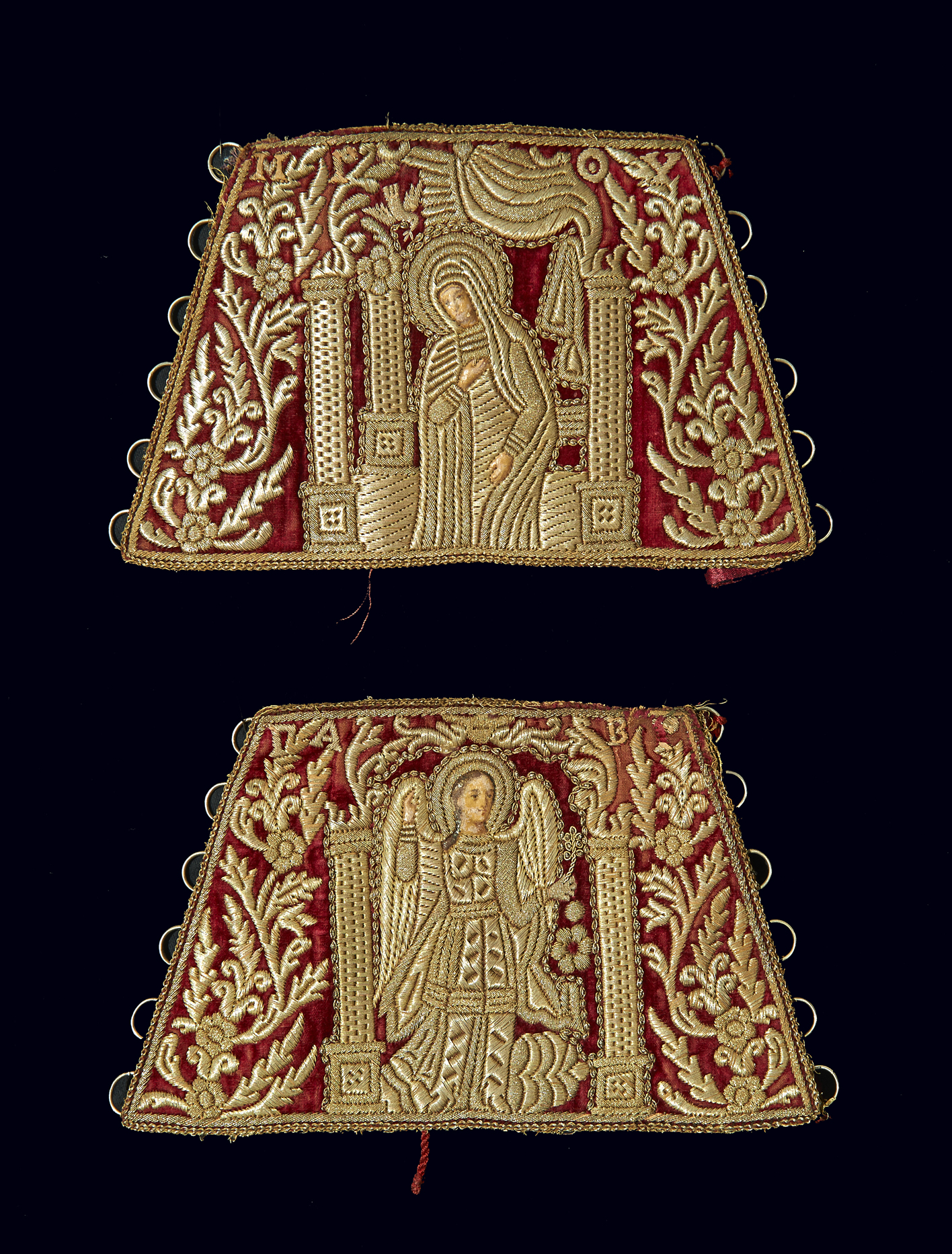 Αγίων και της σκηνής του Ευαγγελισμού στα ζεύγη επιμανικίων, μέσα σε πλούσια
